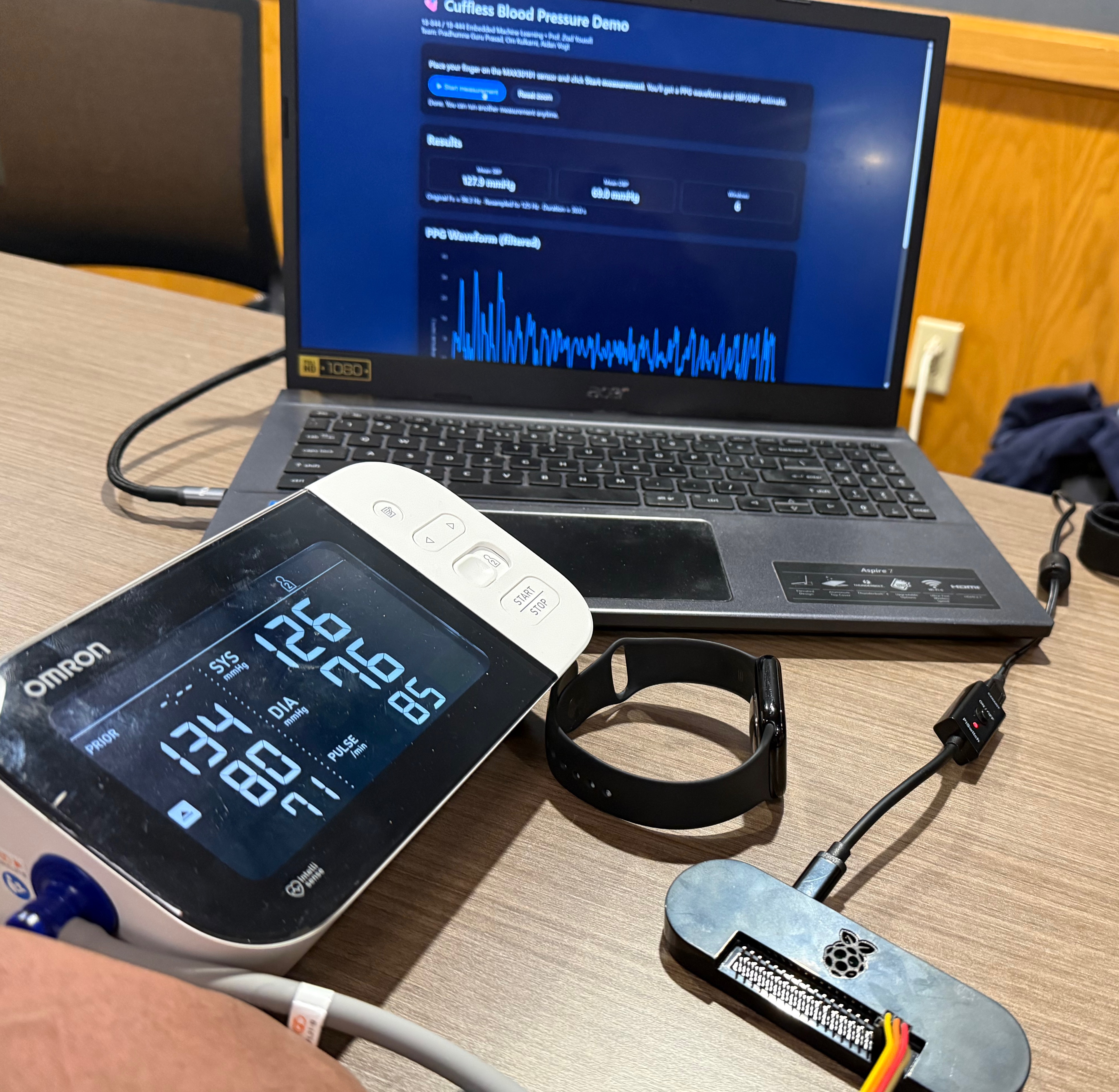In the current state, blood pressure monitoring is episodic and intrusive (cuff). The gap: Hypertension is dynamic – A snapshot once in a while misses the full picture. Our solution: An embedded deep learning enabled device with the capability of continuous, passive monitoring using a single optical sensor.