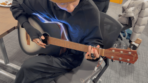 Guitar Helper: an embedded ML system that listens to short audio snippets of strummed chords and classifies them in real time. Beginners struggle with chord memorization and fast chord changes. It is also difficult to find chord progressions online for less popular songs. We wanted to create a palm-sized “Guitar Helper” that listens to songs and lights up the next chord on the fretboard (fingerboard) in real time using an embedded ML model.